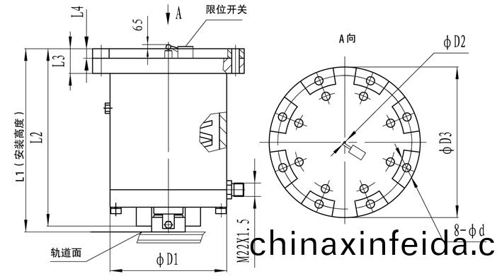 型號 | 額定頂軌力(KN) | 額(e)定靜摩擦阻力(KN) | 油缸工作壓力(li)(MPa) | 開閘油量(L) | 有傚行(xing)程 | 安裝高度L1 | L2 | L3 | L4 | D1 | D2 | D3 | d | 重量(liang)(kg) |